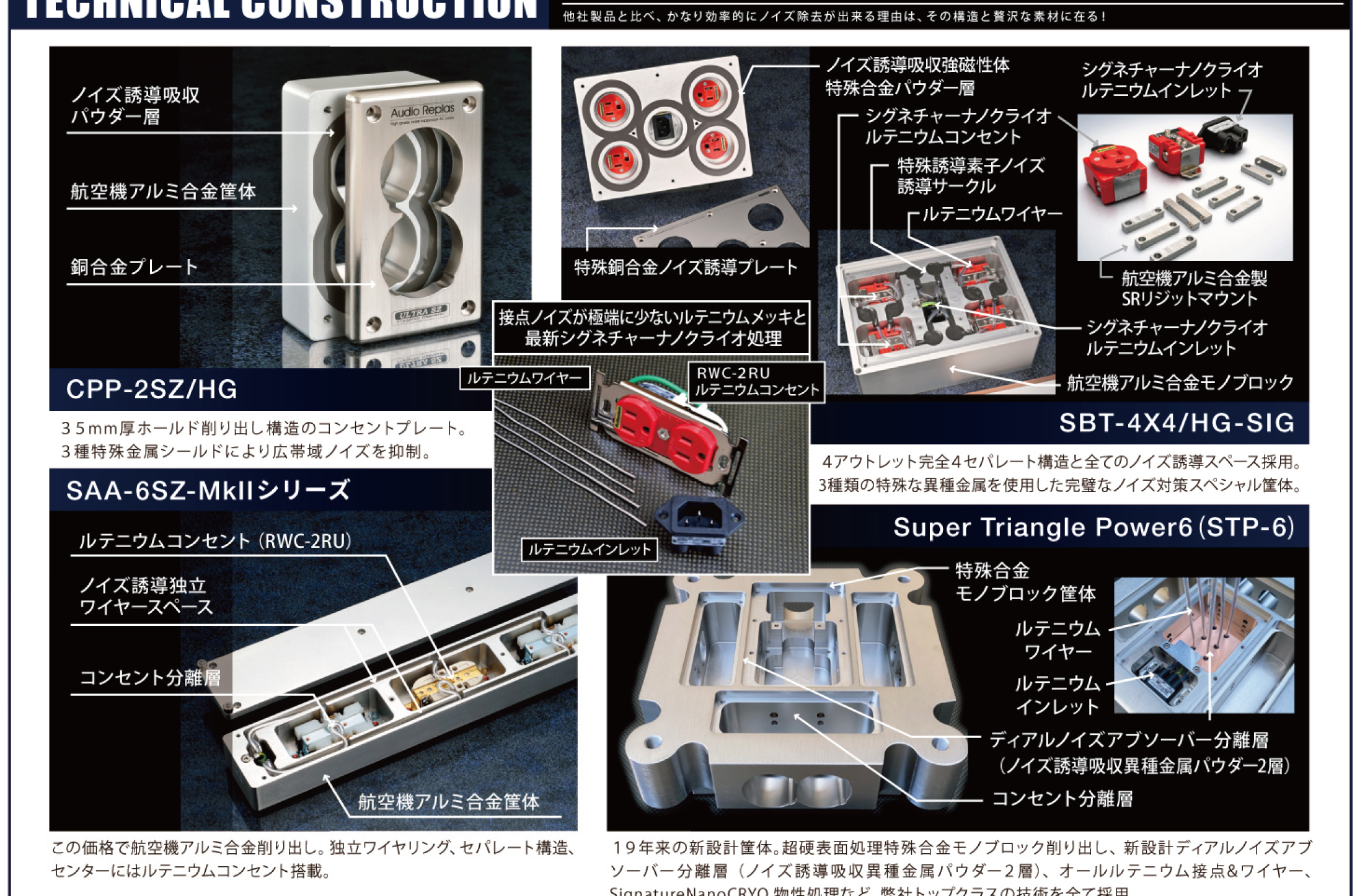 世界中から厳選した素材の機能や可能性を引き出すためには、当然ながら技術力の高さも求められます。ケーブルやコンセント、プラグなど、当社の製品に幅広く用いられているのが「ウルトラSZ物性処理技術」。極低温処理や電磁界処理により素材の分子クラスター構造が均一に変化し、材質を加工する際に発生する歪みを排除し安定した材質にする当社独自の技術です。その他にもルームチューニング製品には周波数に応じた音の反響を正確に拡散させるシステムが、また電源関連の製品には高周波ノイズを電源の外側に沿わせて逃す”誘導フィルター”構造が採用されているなど、あらゆる技術を結集し、細部までこだわり抜いた製品となっています。これらの複雑な構造を高い精度で再現するため、すべての製品を日本国内で製造。ネジを締めるトルクの数値からハンダづけのタイミングに至るまで誤差を最小限に抑えるなど、精密かつ精巧な日本の技術力が余すところなく取り入れられています。